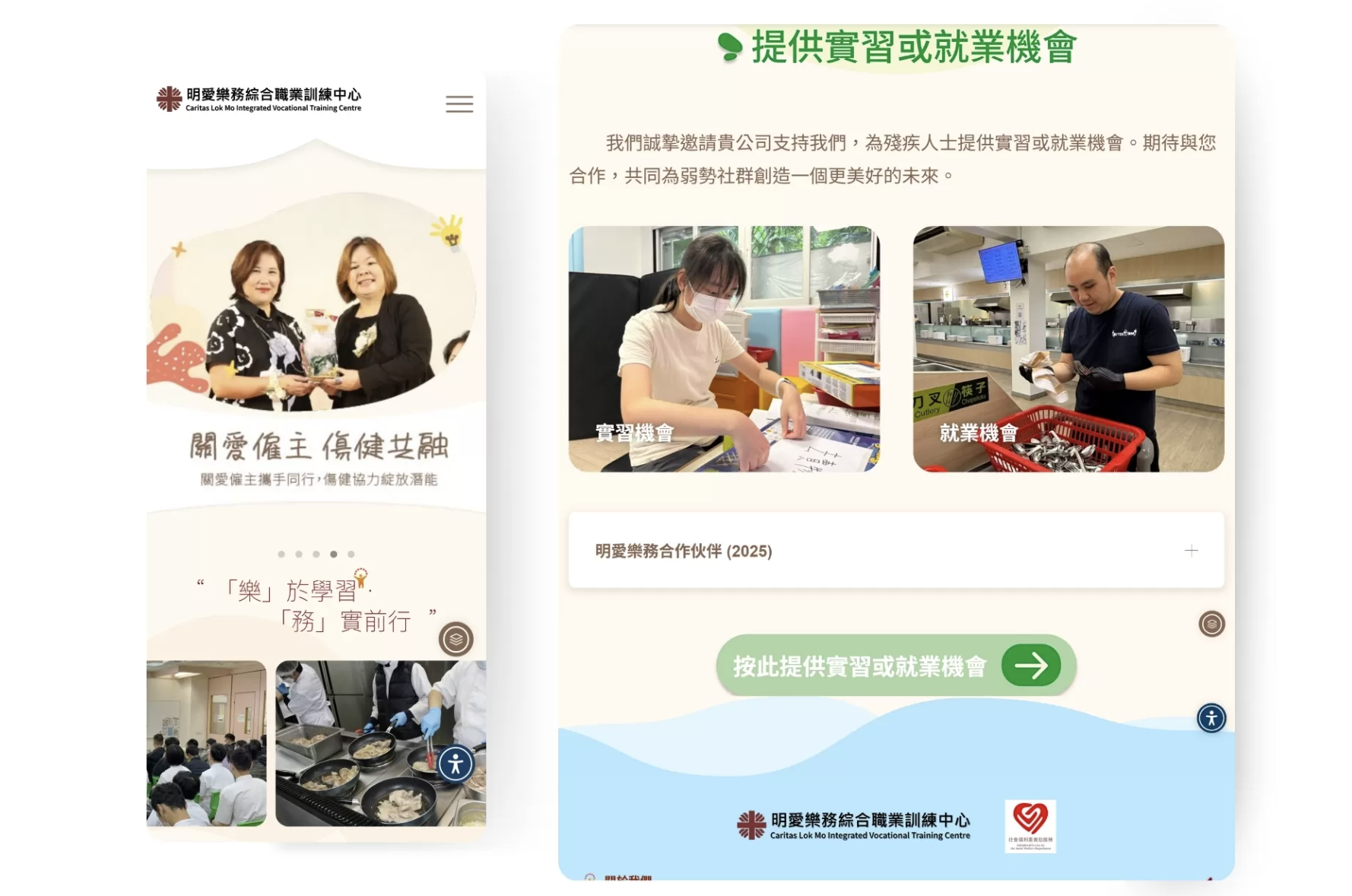 明愛樂務綜合職業訓練中心為有特殊學習需要的青少年與殘疾人士提供多元化的職業技能訓練服務。透過多頁式網站設計,不僅完整介紹中心提供的職業訓練項目與核心理念,也藉由完善的無障礙網頁設計,讓不同能力的使用者都能平等且便利地獲取資訊。
