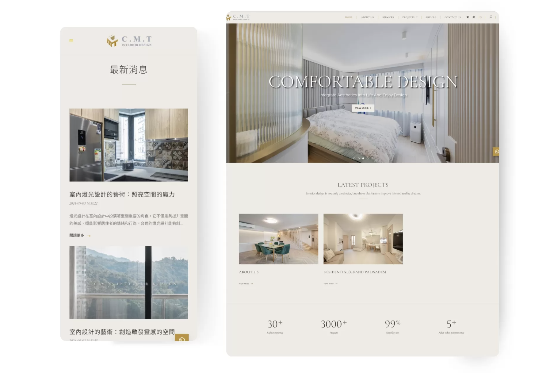 首頁展示「30+年經驗」、「3000+項目」、「99% 滿意度」等關鍵數據,迅速建立專業信賴感。同時,在「最新項目」區域以高質感視覺強化設計實力,搭配專業文章,系統性塑造行業權威形象。